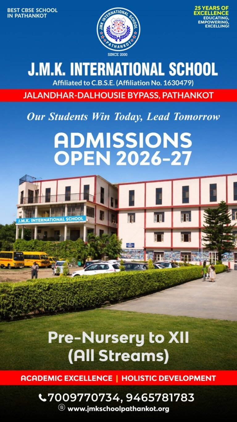 J.M.K International School Pathankot set on the banks of the River Chakki. The students are treated to a visual panorama of the immense Dhauladhars as they enter the school every morning. It is a co – educational school affiliated to the Central Board of Secondary Education, New Delhi and offers to its students Humanities, Science and Commerce.